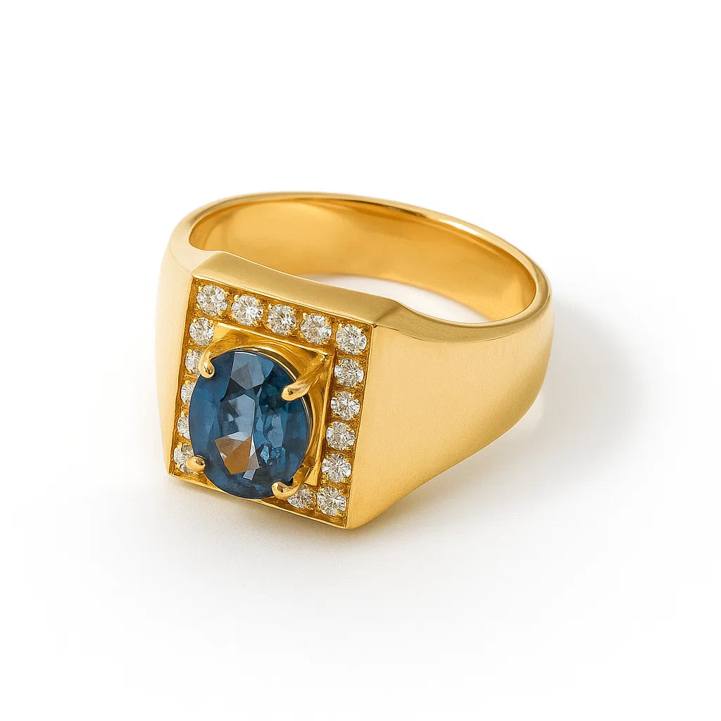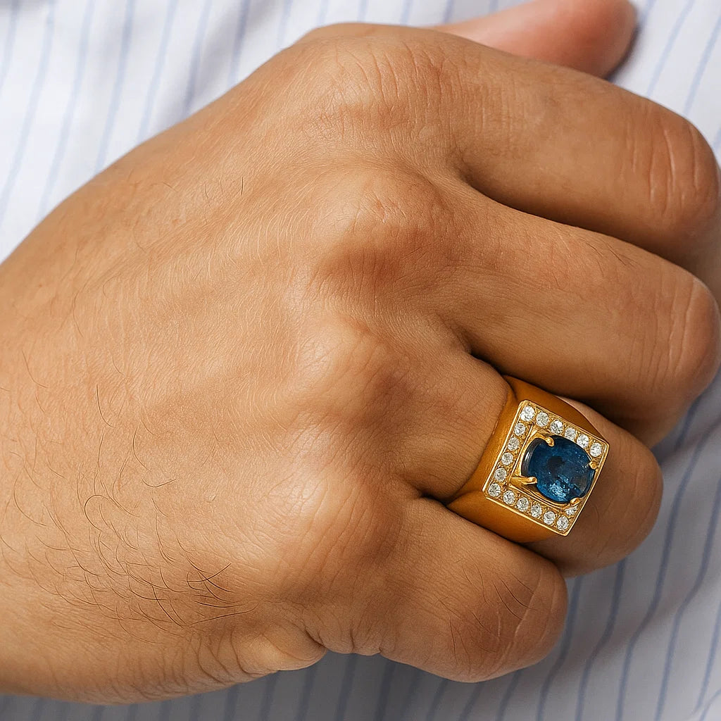 Introducing AOU - our first design with a stunning heated sapphire stone as the centerpiece for added color to any outfit. This versatile piece from our men's collection can also be worn by women, perfectly blending masculinity and femininity.