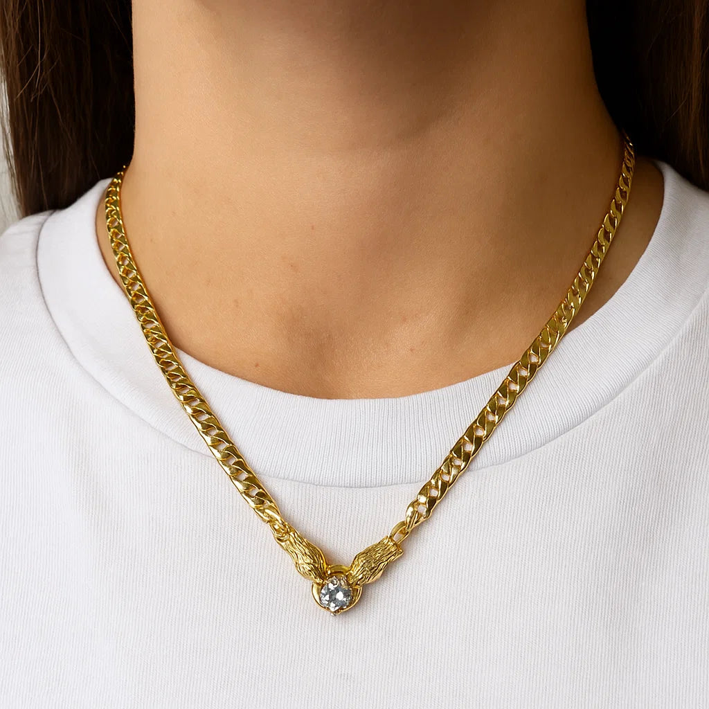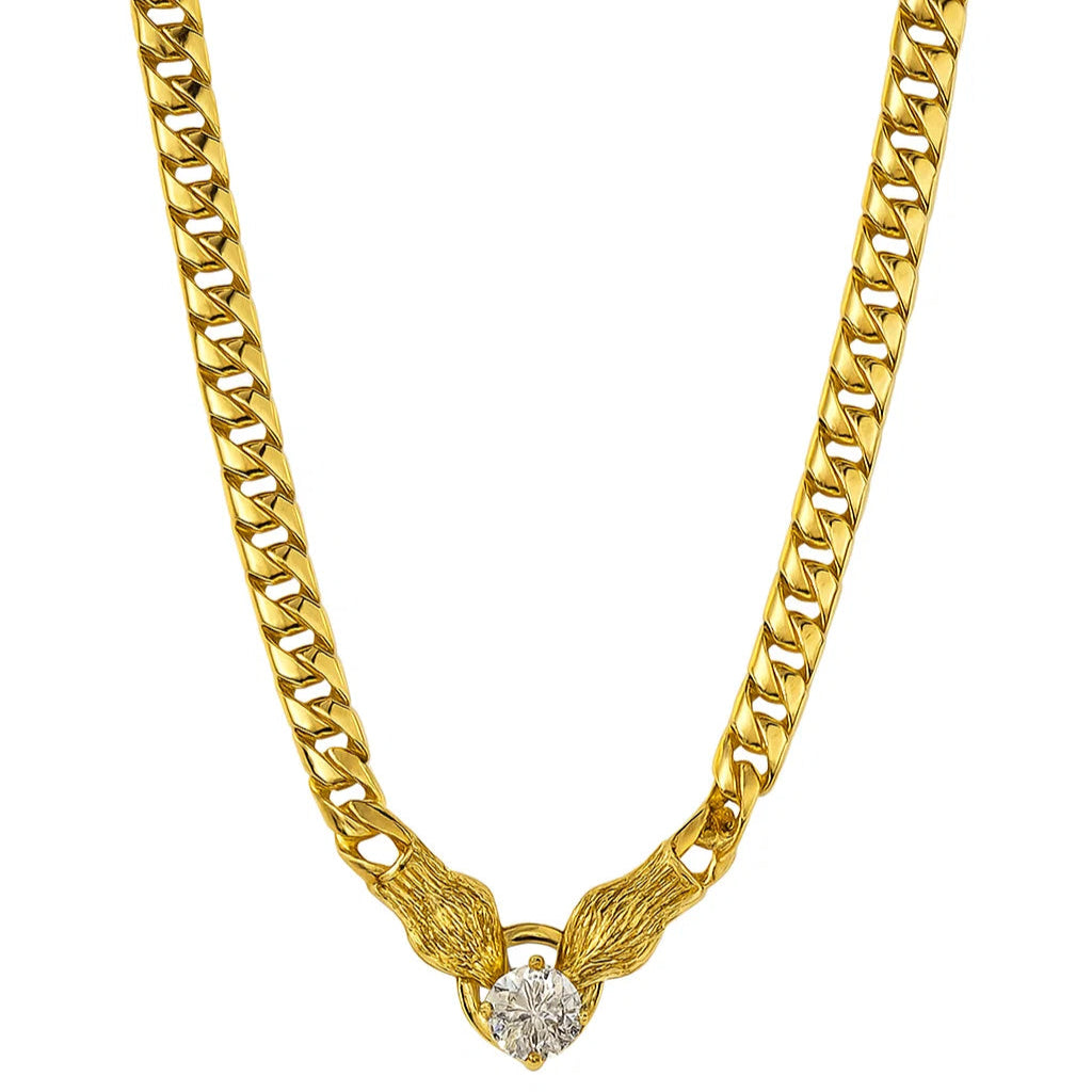 The exquisite NAGA is adorned with a circular white diamond at its center, reminiscent of a serpent's captivating charm. Its 18K gold chain enhances the allure of this stunning piece.