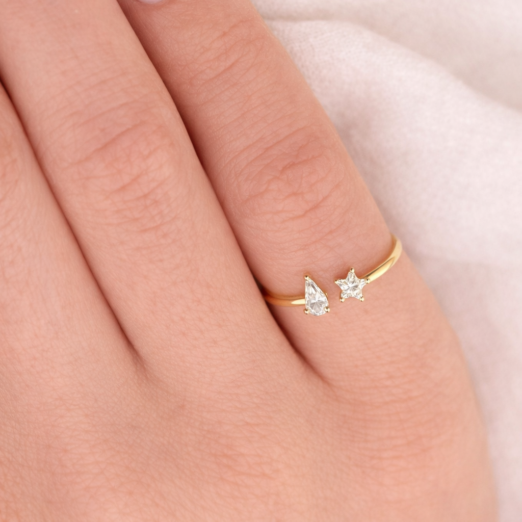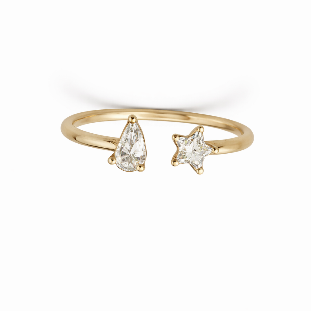 A dazzling star diamond paired with a charming half heart creates an ideal duo for you and your closest friend. SANA and KIHO symbolize the unbreakable bond between those who cherish one another, vowing to remain together for a lifetime.