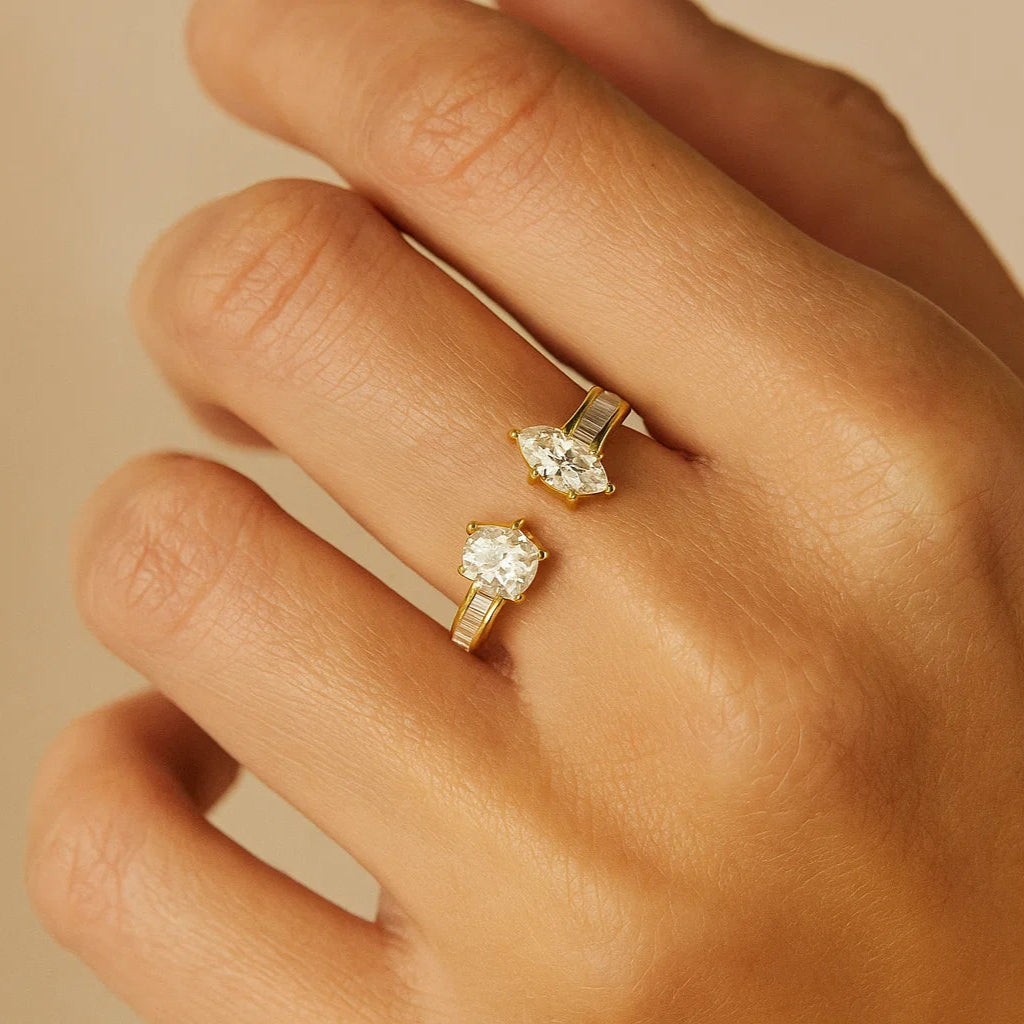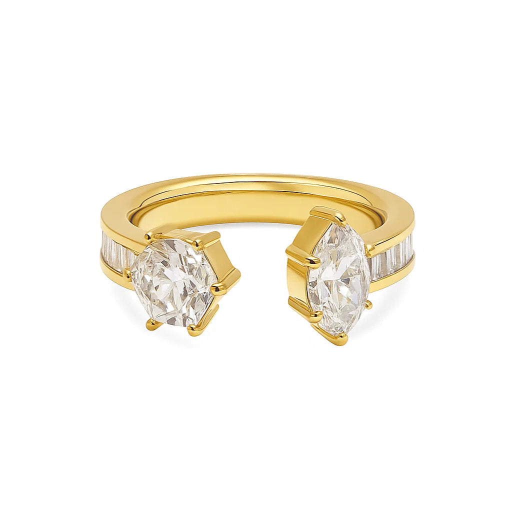 YUNA showcases two stunning fancy-shaped diamonds as its focal point, surrounded by pink tapered diamonds in a timeless eternity setting. This versatile ring can be worn on its own, or flipped to the eternity side for a more understated appearance.